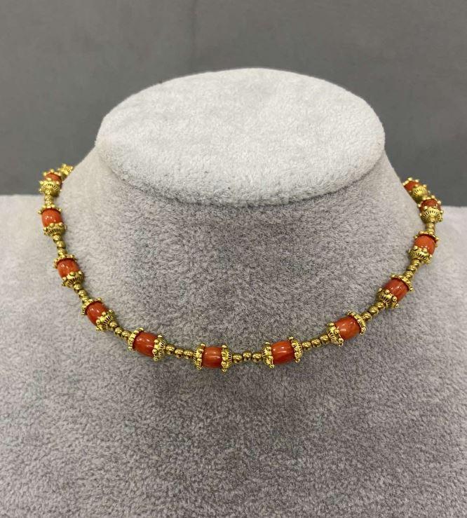 Чокер Корал барило 6х4,5мм+- Гематит кулька 2мм+- L-38см подовжуючий ланцюжок + 5см